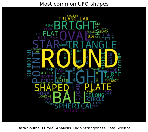 From the word cloud we can see that the most common descriptions of the shape of an UFO are “round”, “ball” and “oval”. Words round and ball seem to point in direction of the orb type UFO. Word oval is not as easy to interpret. For example, disc seen from below might have an oval looking shape.